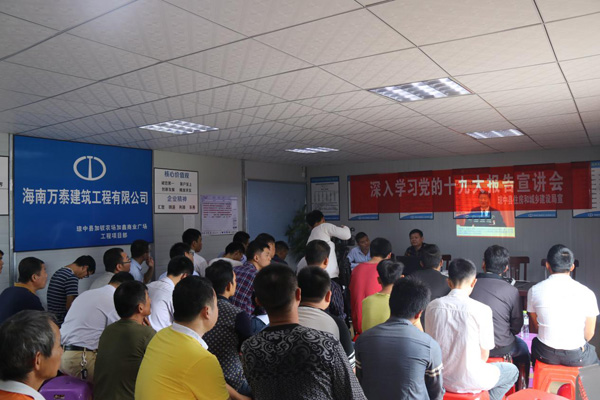 為深入貫徹落實(shí)十九大精神,將十九大精神全面、系統(tǒng)的傳達(dá)給一線工人,按照公司的總體要求和部署,繼11月25日成功舉行第一次十九大精神宣講會后,海南萬泰計劃將在各項(xiàng)目部以豐富多樣的形式貫徹落實(shí)十九大精神。11月30日,由瓊中縣住建局相關(guān)領(lǐng)導(dǎo)組成的宣講團(tuán)到海南萬泰承建的瓊中縣加釵農(nóng)場加鑫商業(yè)廣場項(xiàng)目開展十九大精神宣講會。項(xiàng)目部全體工人、瓊中縣各工程建設(shè)項(xiàng)目代表參加了宣講會。