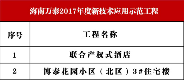 近日,海南省住房和城鄉(xiāng)建設廳發(fā)布公告,公布了2017年度海南省建筑業(yè)新技術應用示范工程立項評審結果,共計24項工程獲評新技術示范工程。其中,海南萬泰建筑住工程有限公司承建的“聯(lián)合產權式酒店“和”博泰花園小區(qū)(北區(qū))3#住宅樓“兩個項目名列榜單。