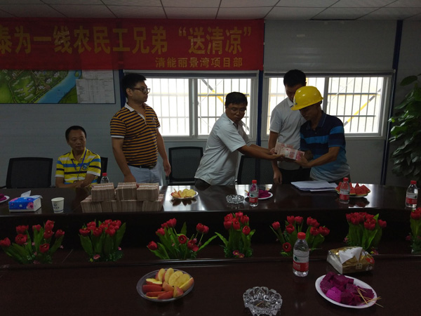 海南萬泰建筑工程有限公司五指山清能·麗景灣一期一標項目部在會議室組織農(nóng)民工工資集體發(fā)放暨海南萬泰建筑工程有限公司“送清涼”活動。此次共計發(fā)放農(nóng)民工工資150余萬元現(xiàn)金。共送去夏季防暑涼茶50箱、綠豆300斤、冰糖150斤等一批物質(zhì)。