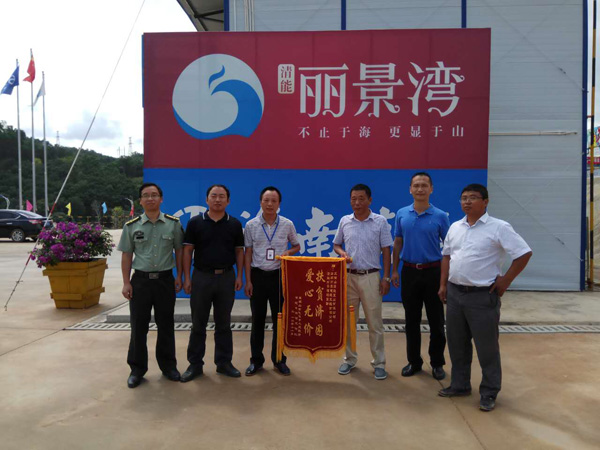 五指山市毛道鄉(xiāng)武裝部部長胡國萬為海南萬泰清能麗景灣項(xiàng)目部送錦旗。