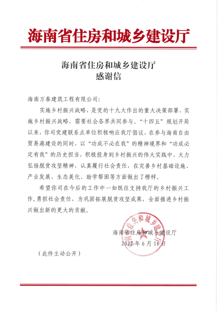 盛夏六月,喜事連連。在海南萬泰建筑工程有限公司成立十一周年之際,公司喜獲海南省住房和城鄉(xiāng)建設(shè)廳的感謝信,信中表彰了萬泰公司響應(yīng)省住建廳倡議,積極投身到鄉(xiāng)村振興事業(yè),大力弘揚(yáng)脫貧攻堅(jiān)精神,認(rèn)真履行社會(huì)責(zé)任,在完善鄉(xiāng)村基礎(chǔ)設(shè)施、產(chǎn)業(yè)發(fā)展、生態(tài)美化、助學(xué)幫困等方面做出了榜樣。