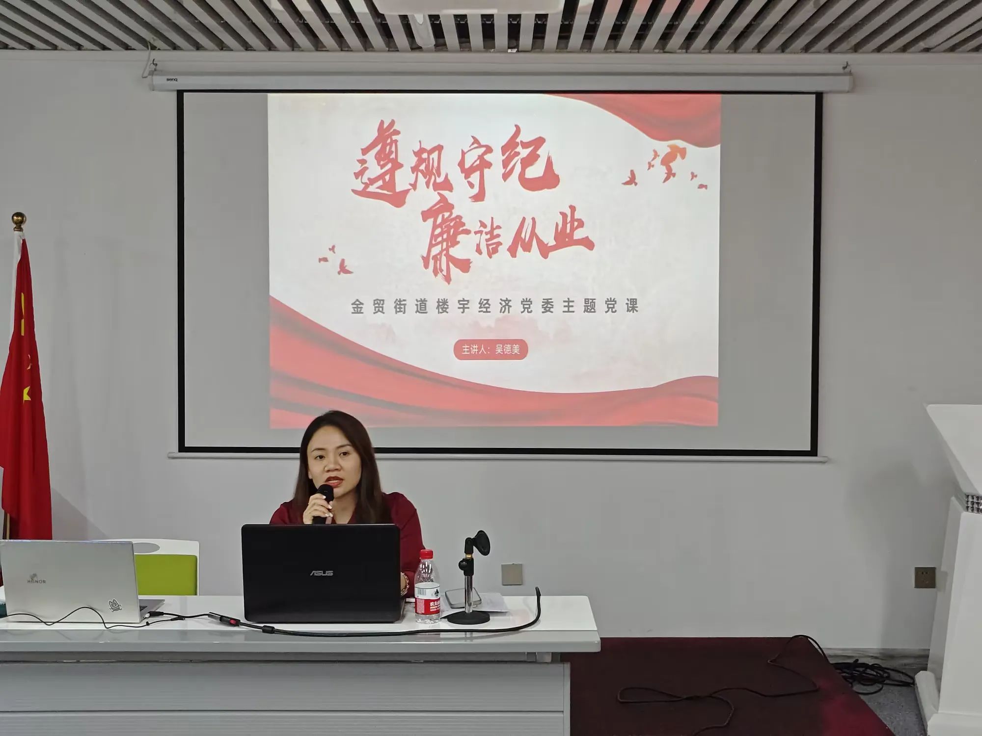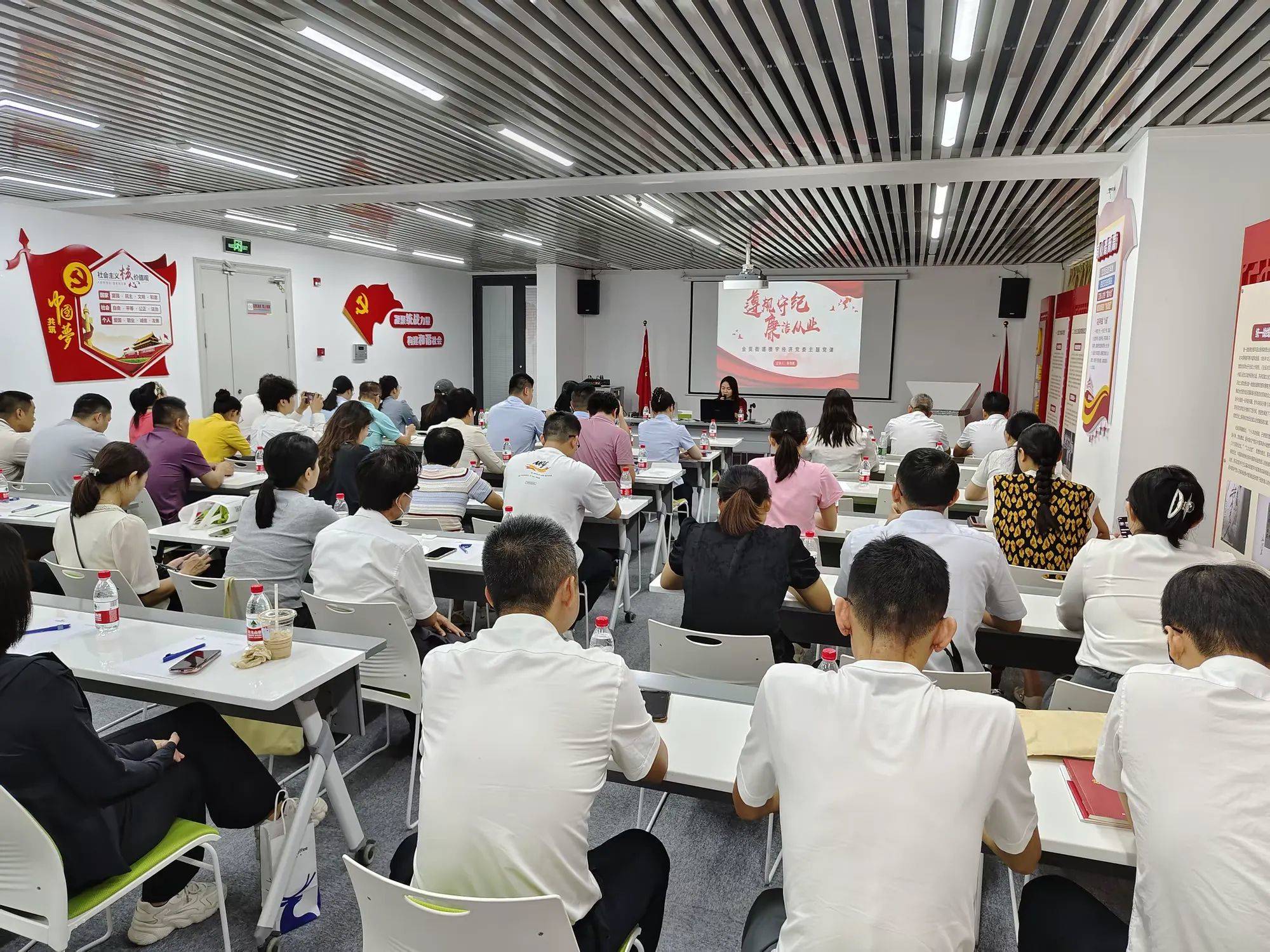 活動中,金貿(mào)街道樓宇經(jīng)濟黨委書記吳德美以“遵規(guī)守紀 廉潔從業(yè)”為主題為大家講授了一堂深刻的黨課,從廉潔從業(yè)的有關規(guī)定、意義、企業(yè)關鍵崗位廉潔風險點及防控措施、警示案例等多方面強調(diào)了廉潔從業(yè)的重要性。