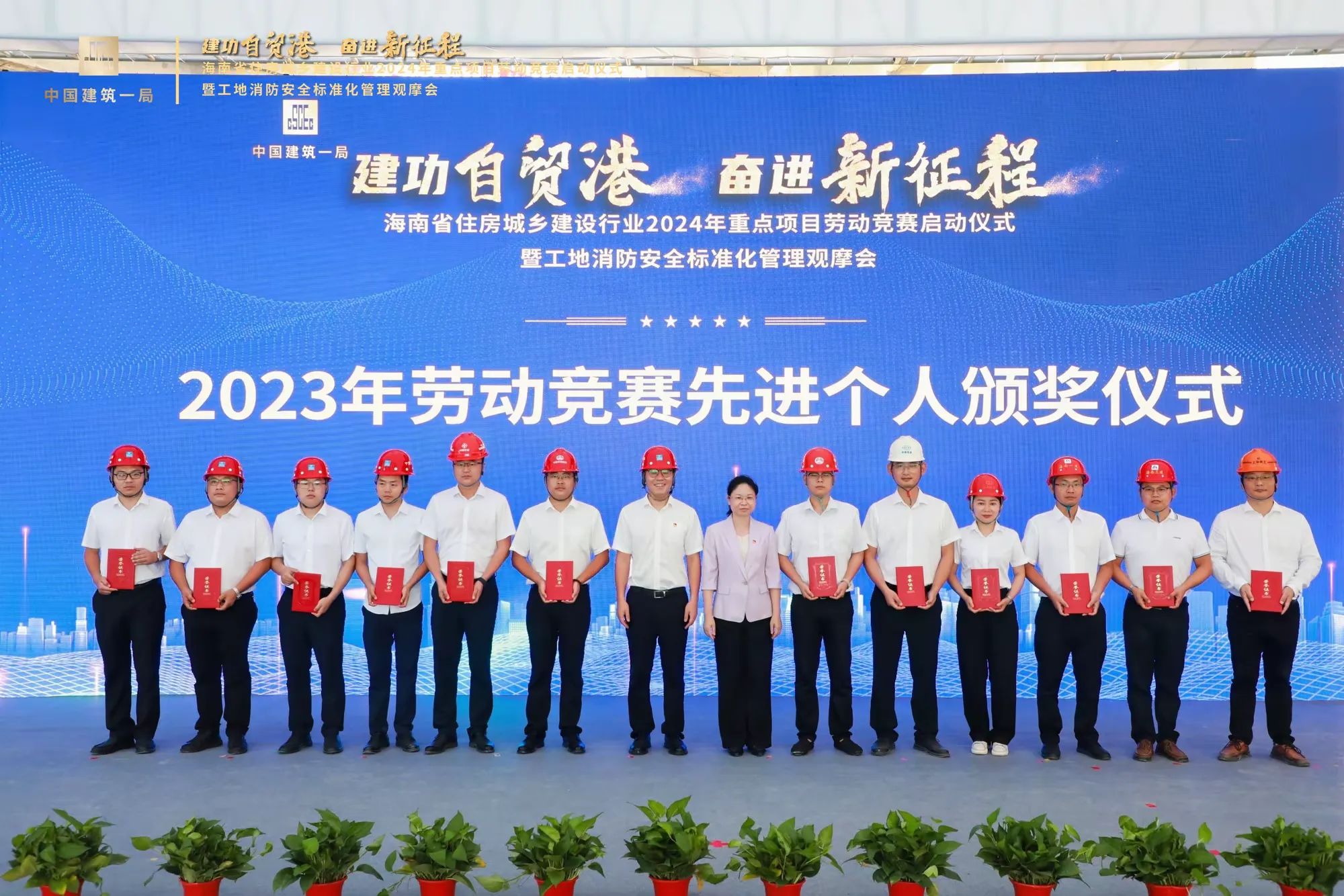 在啟動儀式現(xiàn)場,公司林慧同志作為29名海南省住房城鄉(xiāng)建設行業(yè)2023年重點項目勞動競賽“先進個人”之一上臺領獎,張豪杰同志作為公司代表上臺進行參賽單位宣誓。本次勞動競賽以“七比一創(chuàng)”為主要內容,即“比黨建引領、比工程進度、比工程質量、比安全生產、比科學管理、比技術創(chuàng)新、比文明施工、創(chuàng)優(yōu)質工程”,進一步激發(fā)廣大職工不斷提升自身能力水平,勇于奉獻、干事創(chuàng)業(yè)的熱情。