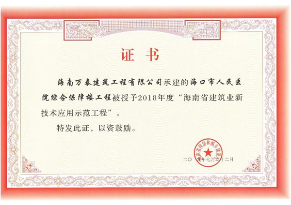 近期,海南省住房和城鄉(xiāng)建設廳下發(fā)了《關于公布2018年度海南省建筑業(yè)新技術應用示范工程的通知》,由我司承建的??谑腥嗣襻t(yī)院綜合保障樓項目,獲評“2018年度海南省建筑業(yè)新技術應用示范工程”。