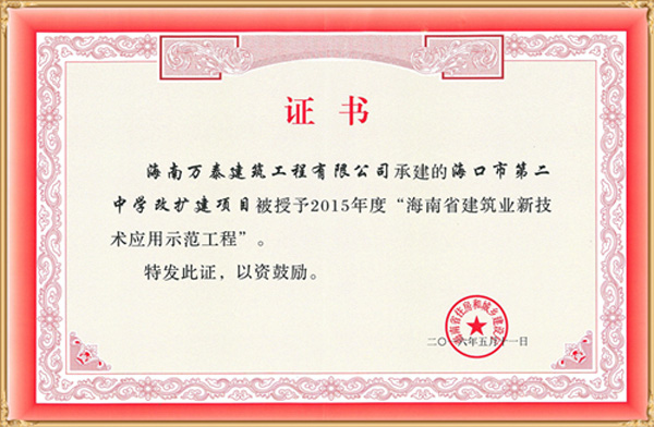 由海南萬泰建筑工程有限公司承建的“海口市第二中學(xué)改擴建項目”被海南省住房和城鄉(xiāng)建設(shè)廳授予2015年度“海南省建筑業(yè)新技術(shù)應(yīng)用示范工程”。
