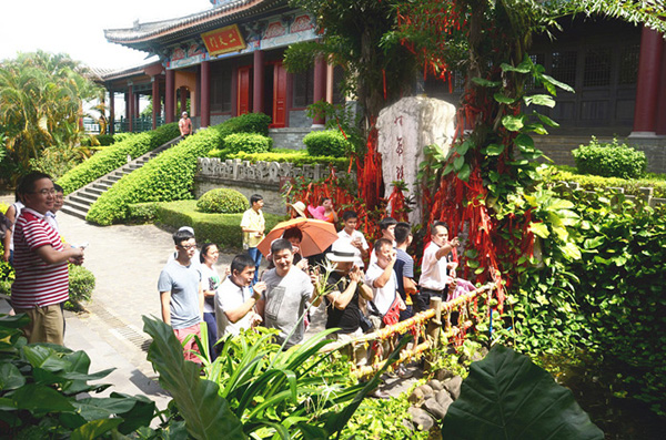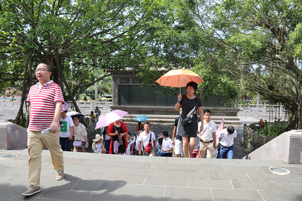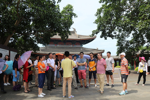 認(rèn)真聽導(dǎo)游講解玉蟾宮的文化特色