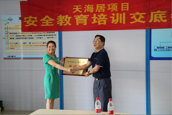 由海口市建設(shè)工程質(zhì)量監(jiān)督站副站長吳坤順為“天海居”項(xiàng)目頒獎。
