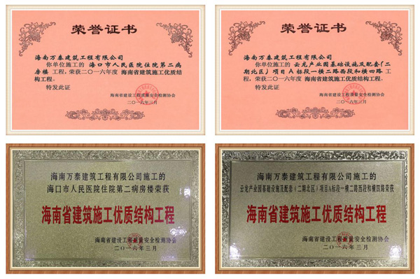 2016年3月,由海南萬泰建筑工程有限公司承建的“??谑腥嗣襻t(yī)院住院第二病房樓”及“云龍產業(yè)園基礎設施及配套(二期)項目”工程被海南省建設工程質量安全檢測協(xié)會評為《海南省建筑施工優(yōu)質結構工程》榮譽稱號。