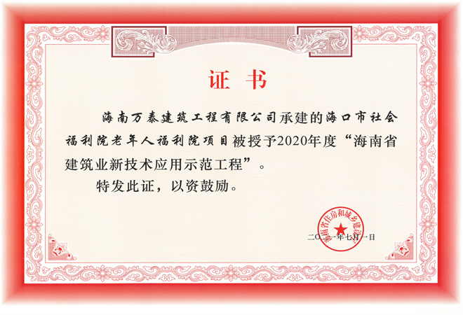 近日,海南萬泰承建的“海口市社會福利院老年人福利院項目”被海南省住房和城鄉(xiāng)建設(shè)廳授予2020年度“海南省建筑業(yè)新技術(shù)應(yīng)用示范工程”。