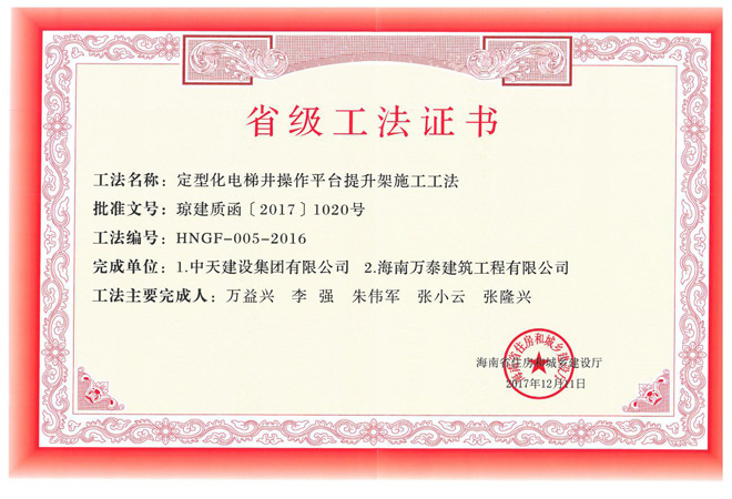 2017年12月5日,海南省住房和城鄉(xiāng)建設廳發(fā)布公告,公布了2016年度海南省省級工法名單。海南萬泰建筑工程有限公司申報的兩項工法(定型化電梯井操作平臺提升架施工工法、加強斜屋面施工質量的組合施工工法)名列榜單,且得票數均為13票,得票率百分之百。